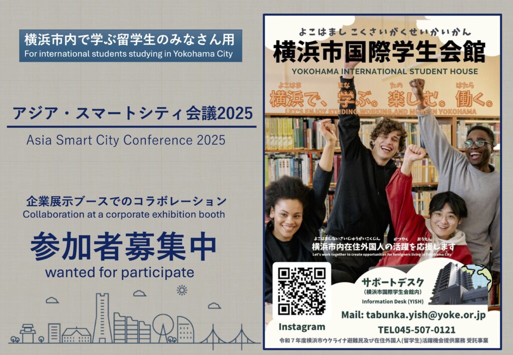 JapaneseEnglish 2025年度 アジアスマートシティ会議:留学生参加募集中 11月26日(水)に、横浜みなとみらいで開催する「アジア・スマートシティ会議」展示ブースで企業とコラボレーションします。企業スタッフのサポートボランティアで交流してみません... -